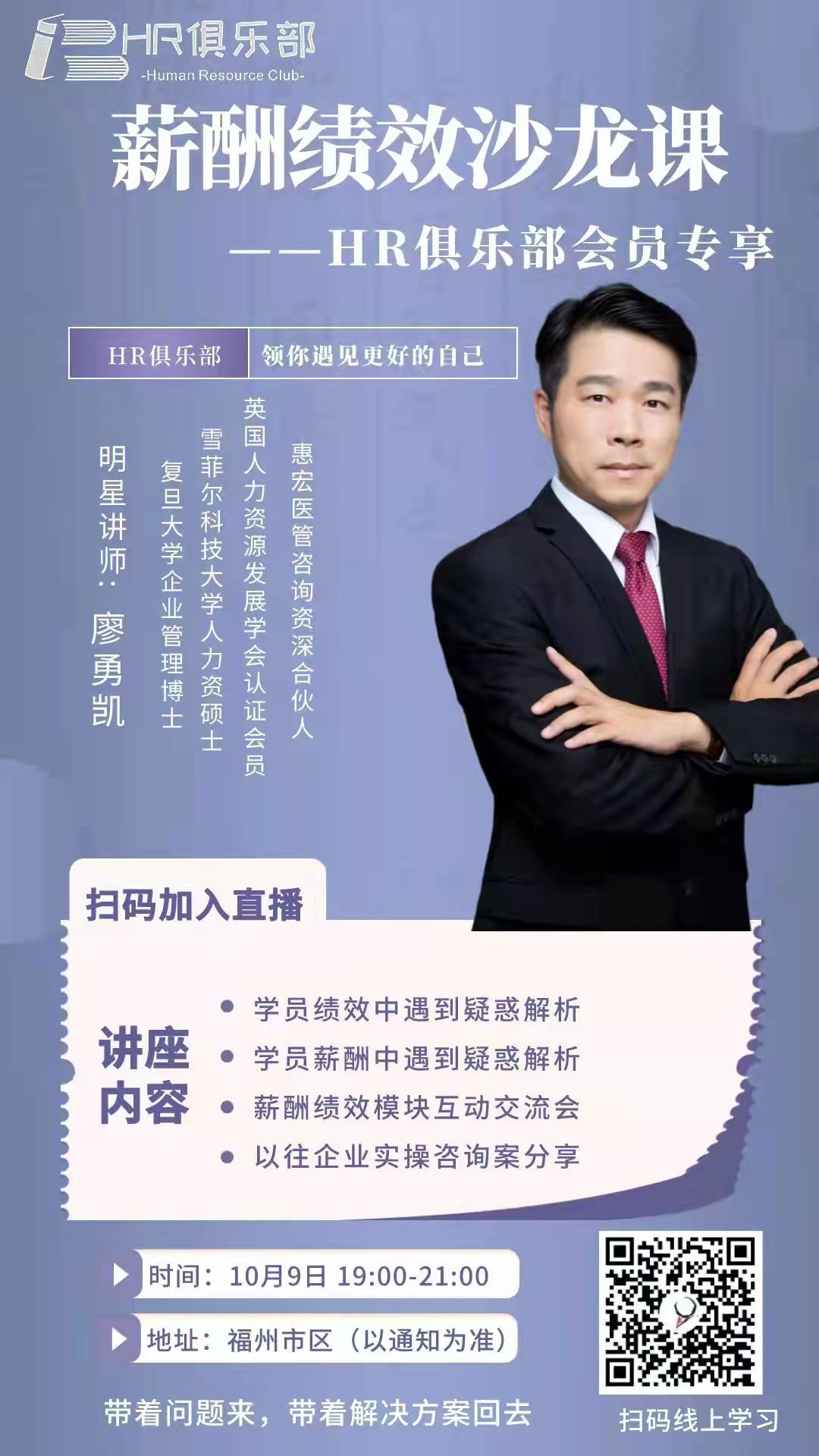 2021年10月9日晚7點至9點,惠宏咨詢資深顧問廖勇凱顧問于福建福州主持了“薪酬績效沙龍課”活動,活動順利落幕。此次活動為HR俱樂部主辦的第一場線上線下相結(jié)合的交流分享會,除了親自到場參與,還有許多與會者通過線上直播加入。活動以問題導向做交流,以帶著問題來,帶著解決方案回去為主旨?;顒觾?nèi)容包括為與會者在績效和薪酬兩方面遇到的疑惑進行解析、薪酬績效模塊互動交流會,以及以往企業(yè)實操咨詢案的分享等。